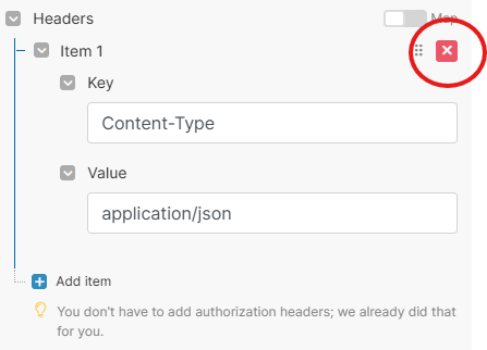 위 스크린샷의 Headers 부분에서 Item1을 선택한 뒤 x 버튼을 눌러 삭제한 후 다시 실행하면 문제없이 작동하는 것을 확인할 수 있습니다.